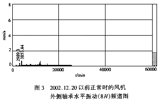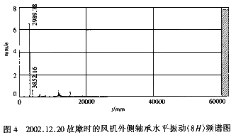 2.對照故障前后風機外側軸承水平振動頻譜圖3和圖4,可以看出圖中有兩個較大的峰值,其特征頻率分別為3853r/min和2989r/min。前者為風機轉速,后者為電機轉速。正常時(圖3),風機的振動水平大于電機。而故障時(圖4),電機振動水平不但遠遠大于正常時的水平,而且也遠遠大于風機水平。因此初步判斷振動原因在電動機及低速齒輪軸部分。