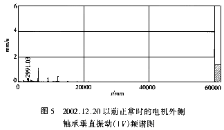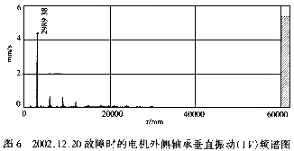 3.再對照故障前后其他測點的頻譜特征,發(fā)現(xiàn)都存在這樣一個現(xiàn)象,即都像風機外側軸承水平振動那樣有一個電機轉速一倍頻的突增,進一步說明振動原因在電動機及低速齒輪軸部分(限于篇幅,僅選示電機外側軸承垂直振動1V故障前后頻譜圖5、圖6)。