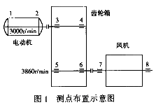 2002年12月20日,香海熱電廠1#爐高壓風機(美國產(chǎn)海本多級離心機),在日常檢測中發(fā)現(xiàn),測點8(圖1)軸承水平振動比平時大出五倍,最大振動有效值7.6mm/s(圖2),已嚴重超過標準。