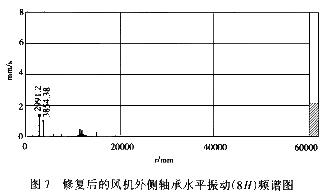 根據(jù)上述分析,及時停機檢查,結果發(fā)現(xiàn):電機風扇的6個扇葉掉了1個,造成了不平衡。風扇修復后測得振動頻譜圖如圖7,振動有效值見表2。各點振動均恢復正常。如故障時最大的風機外側軸承水平振動8H由7.6mm/s降為2.3mm/s。