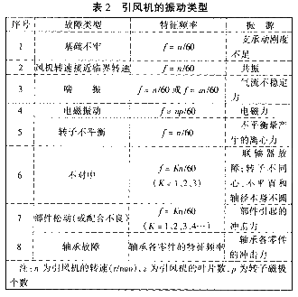 從振動診斷的角度來看,①引風機是一種旋轉(zhuǎn)機械因而有不平衡、不對中之類的故障,②引風機是一種流體機械,有旋轉(zhuǎn)失速、喘振的可能性存在,③引風機受工作環(huán)境的影響,經(jīng)常造成葉片的磨損,介質(zhì)還可能粘附在轉(zhuǎn)子上形成隨機性變化的不平衡,④引風機由電機驅(qū)動,可能存在電磁振動。為此,引風機的振動可歸結為8種類型,見表2。