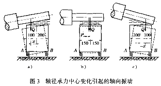 所謂軸承扭振是軸在旋轉(zhuǎn)狀態(tài)下,軸承對軸的承力中心點將隨轉(zhuǎn)速周期性地沿軸向變化。圖3a表示轉(zhuǎn)子在某一位置時,軸承承力中心點偏于A側(cè);圖3c表示轉(zhuǎn)子轉(zhuǎn)過180°后,軸承承力中心點偏于B側(cè)。若軸承座和基礎沒有彈性,則軸承承力中心點的變化始終在軸承座底邊AB范圍內(nèi),它不會引起軸承座的軸向振動。實際上,軸承座和基礎組成的支承系統(tǒng)具有一定的彈性,在軸承承力中心點周期性變化的作用下,軸承座將沿某一底邊發(fā)生周期性的軸向振動,且振值忽大忽小,極不穩(wěn)定。即使軸承座固定螺栓很緊,這種現(xiàn)象也難以避免。